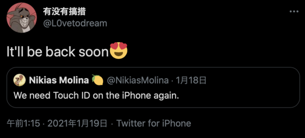 これは「iPhoneにはTouch IDが再び必要だ」という個人のツイートに対し、同氏が「もうすぐ戻ってくる」と引用リツイートしたということ。