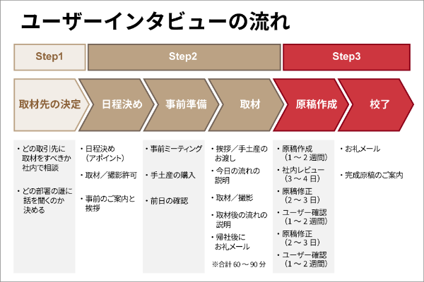 今回紹介するのはB to Bにおけるユーザーインタビューの例だが、B to Cでも基本は同じだ。まずは取材先の決定(Step1)、次にインタビュー(Step2)を実施しよう。原稿作成(Step3)をするか否かは、自社のリソースやそもそもの目的から決めるといいだろう。