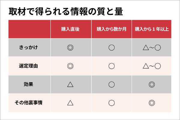 取材先を決める際に、ユーザーが商品・サービスを購入してから何日くらいたっているか? も念頭に置いて決定しよう。購入直後であれば、ユーザーは導入経緯や決め手を覚えているが、効果・満足度は実感値が少ない場合も多々ある。逆に、効果・満足度を感じられた頃にインタビューすると、導入経緯や決め手になった理由を忘れてしまっている場合もある。これはあなたの会社が提供している商品やサービスの特性にもよるが、今回の取材の目的に合ったユーザーを選んで聞くことが大切だ。