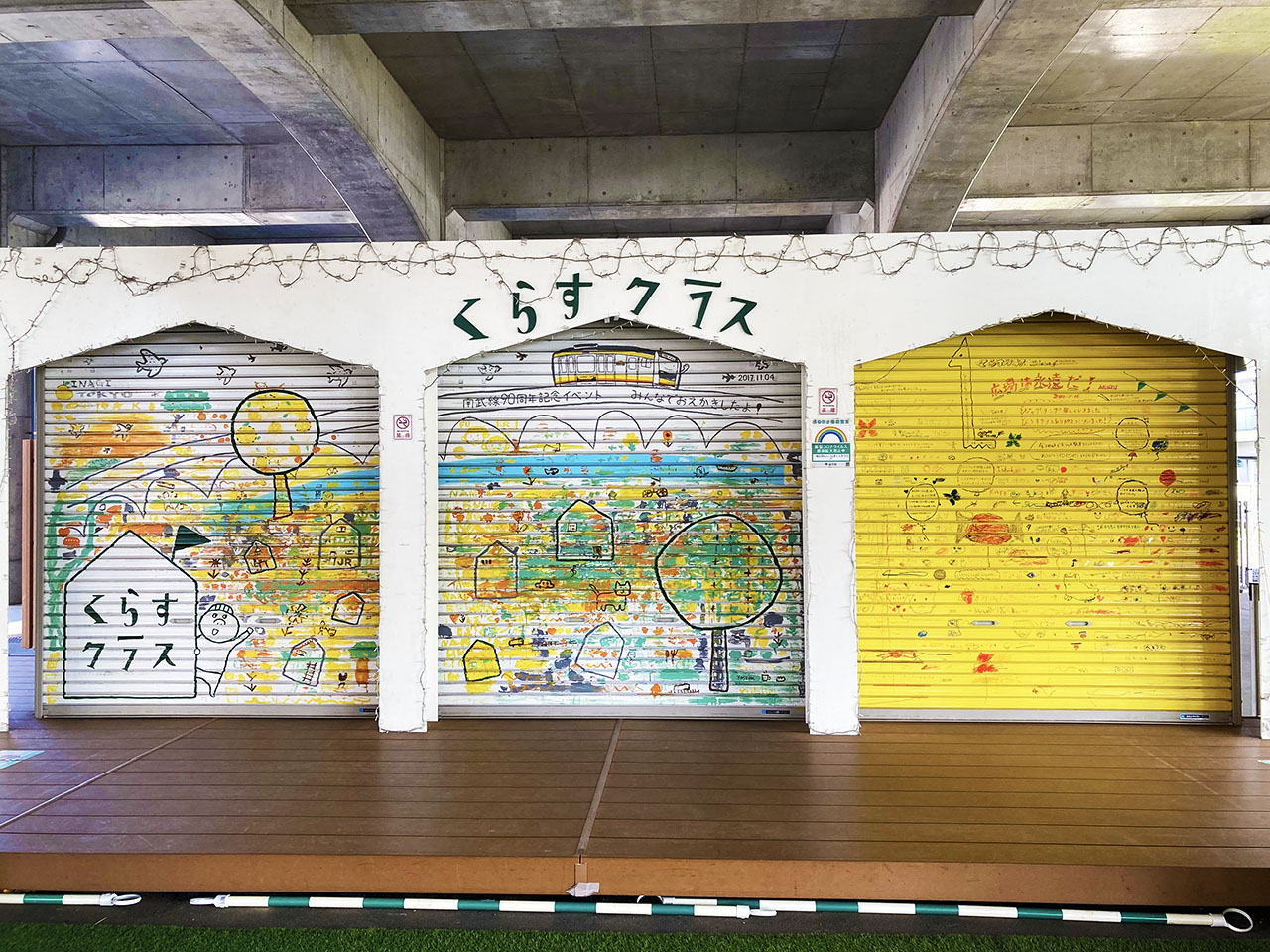 解体される直前の開催となった「くらすクラス広場deマルシェ」(2022年07月16日開催)で、建物のシャッターの右側に、みんなでお絵かきをしました。