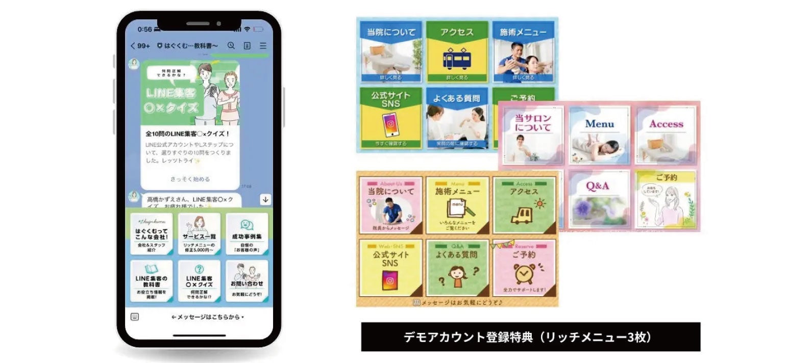 デモアカウント(https://lin.ee/Z3KeJcr)では、登録時アンケート、ステップ配信、○×クイズなど、マーケティングに関わる施策を体験・ご利用いただけます。