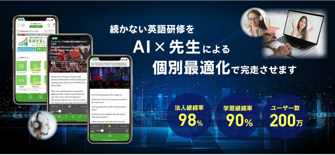 AI (アプリ) x 講師による個別最適化されたカリキュラムでビジネス英語研修をトータルデザインするサービス。