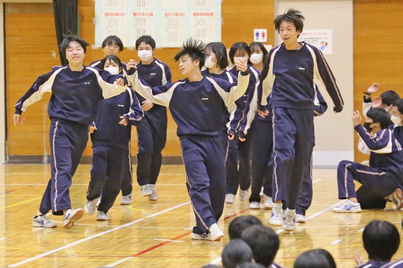 ダンスは約10年前から小中学校で体育の必修科目となり、同校も創作ダンスの授業を年間10時間ほど行う。ダンスフェスはその成果発表の場で、同校独自の催し。初開催した昨年はコロナ禍の感染対策で学年ごとに行ったが、5類に移行した今年は全校生徒が体育館に一堂に集った。