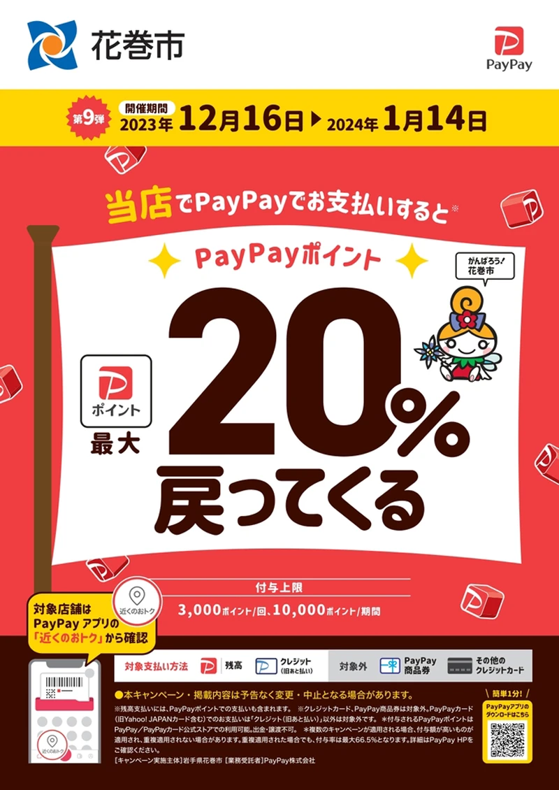【PayPay】12/16よりスタート!第9弾 がんばれ花巻!対象店舗で最大20%戻ってくるキャンペーン♪
